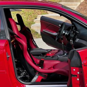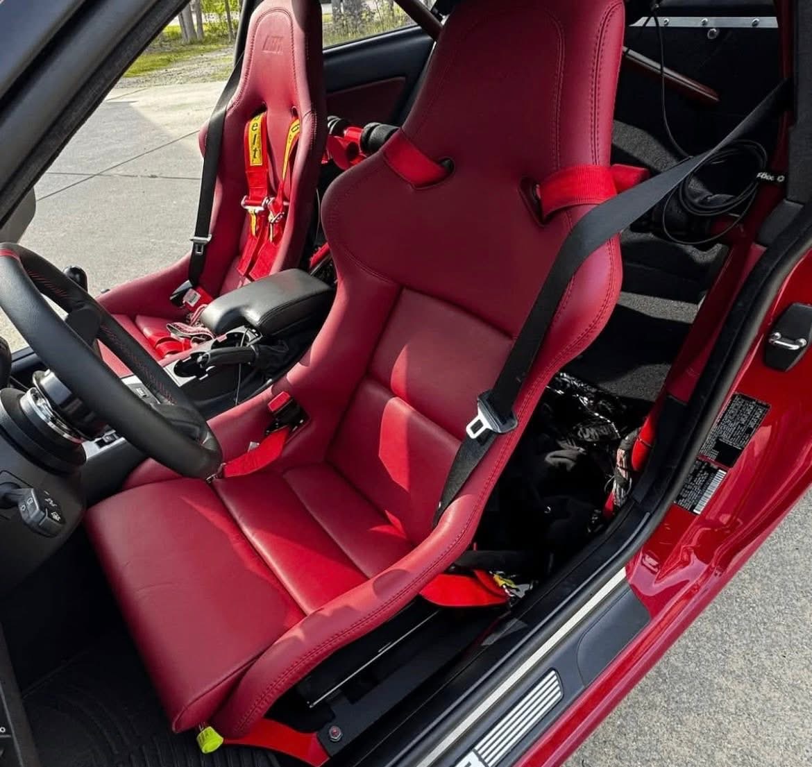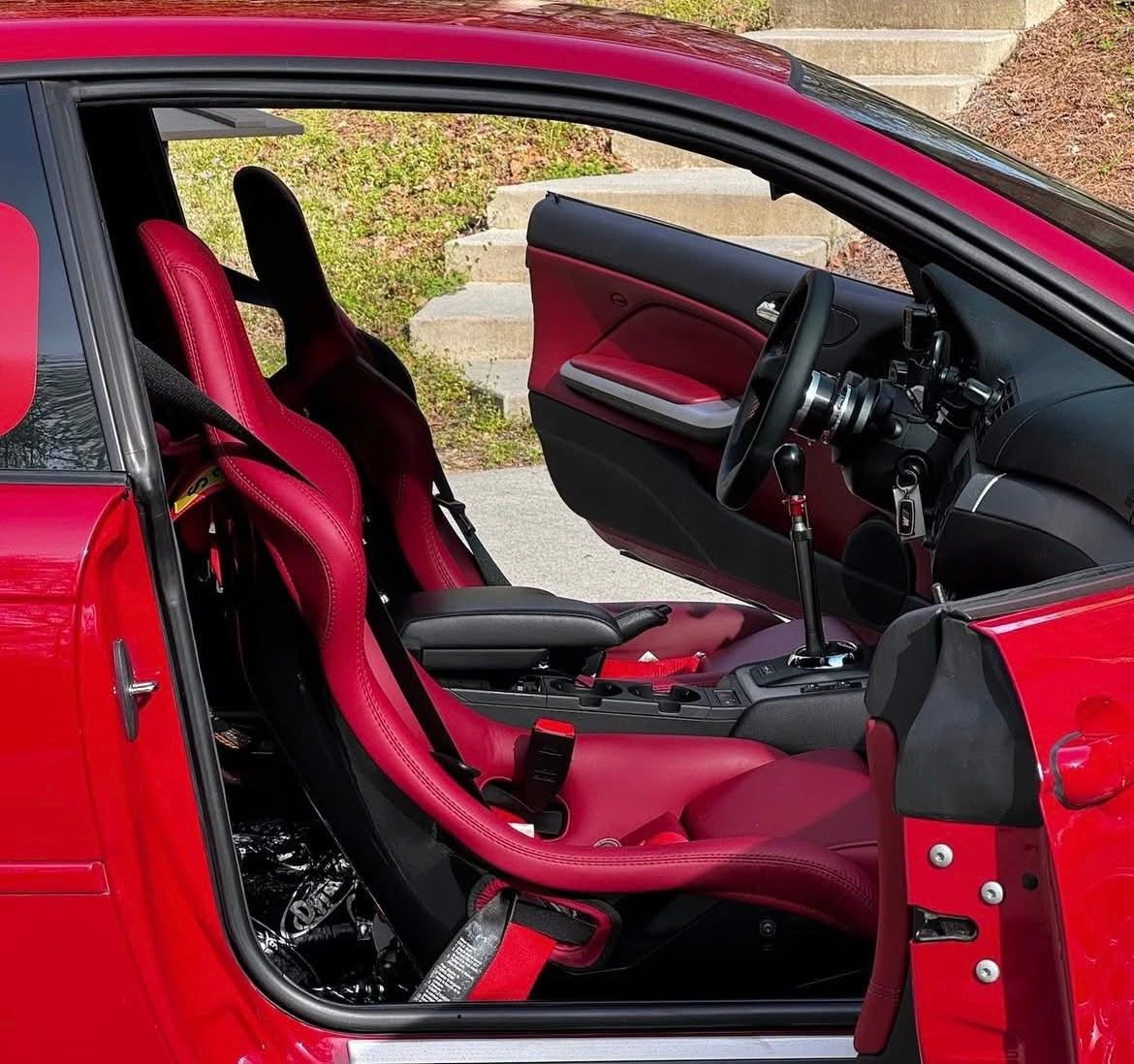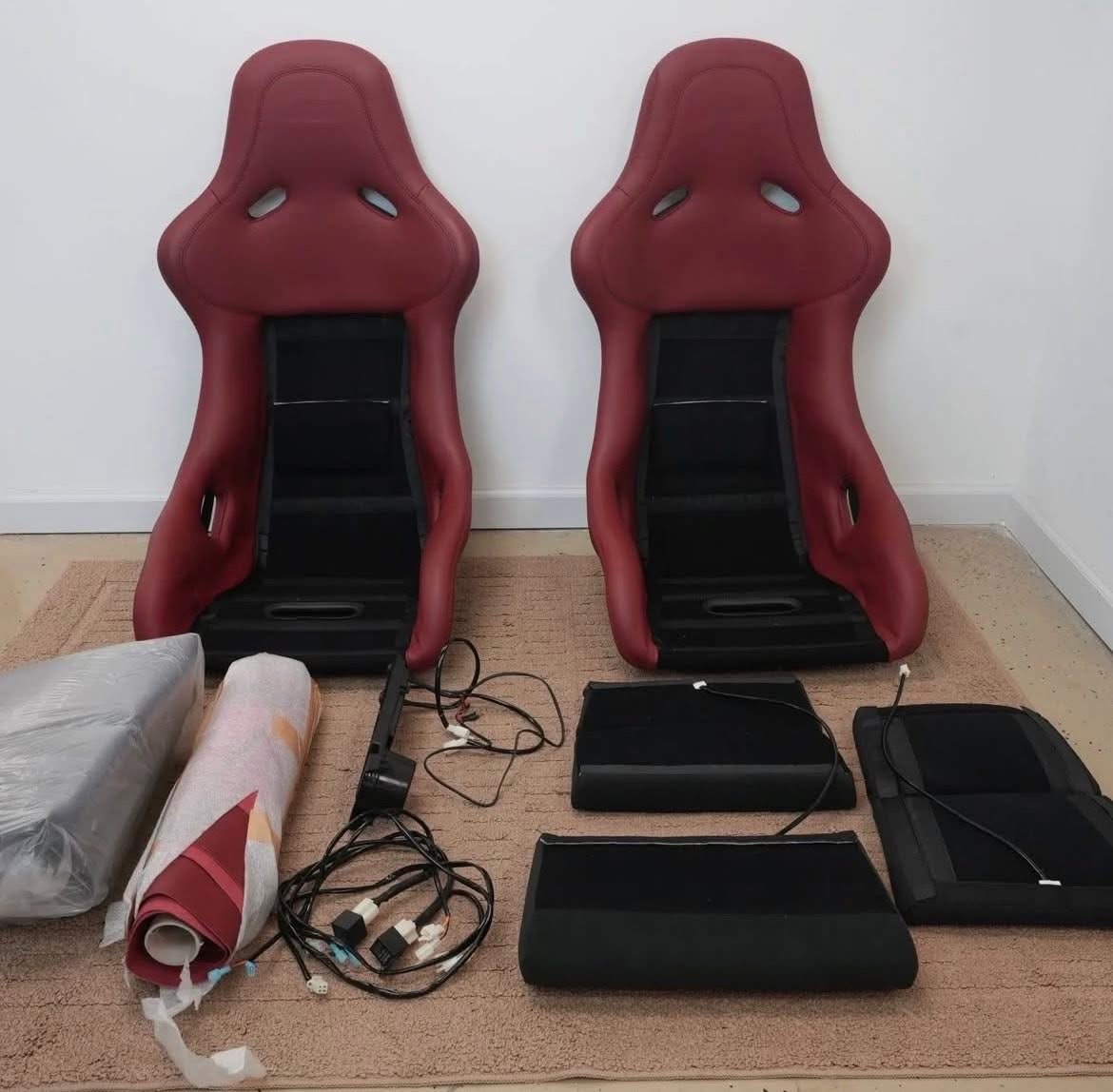 Both seats are equipped with heated seat pads for the base and seat back, making them suitable for both spirited driving and everyday use. This complete package is offered with matching red leather upholstery roll, heated seat wiring, an E46 center console insert with cup holder, and a wireless charger, making it an exceptional and hard-to-find interior upgrade.
