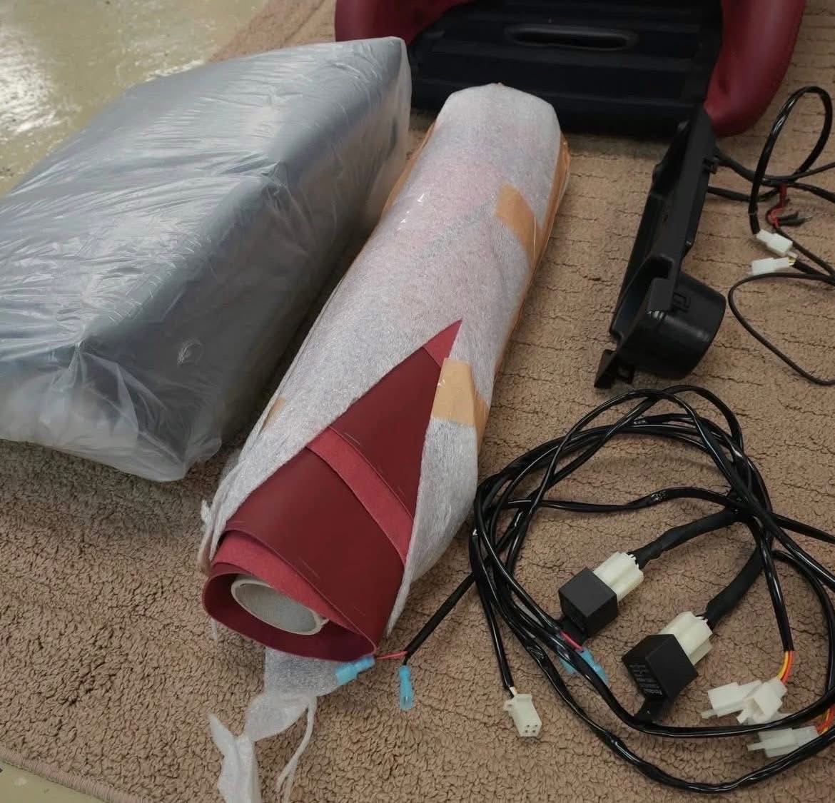 The sale includes a matching red leather upholstery roll, heated seat wiring, an E46 center console insert with cup holder, and a wireless charger.