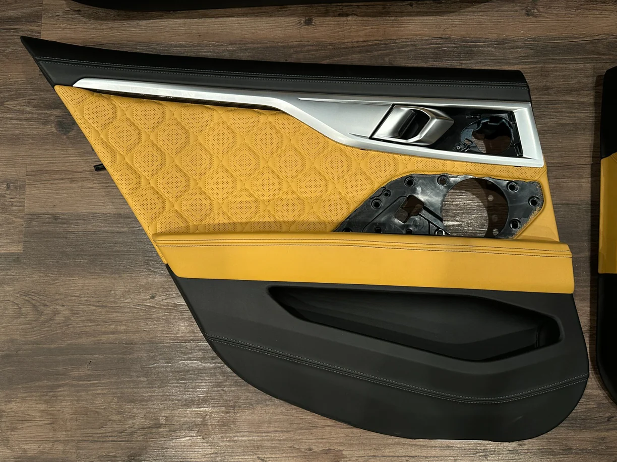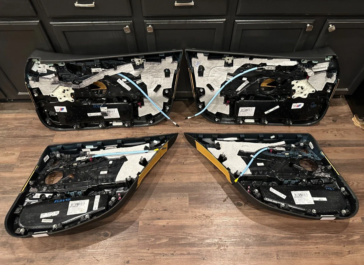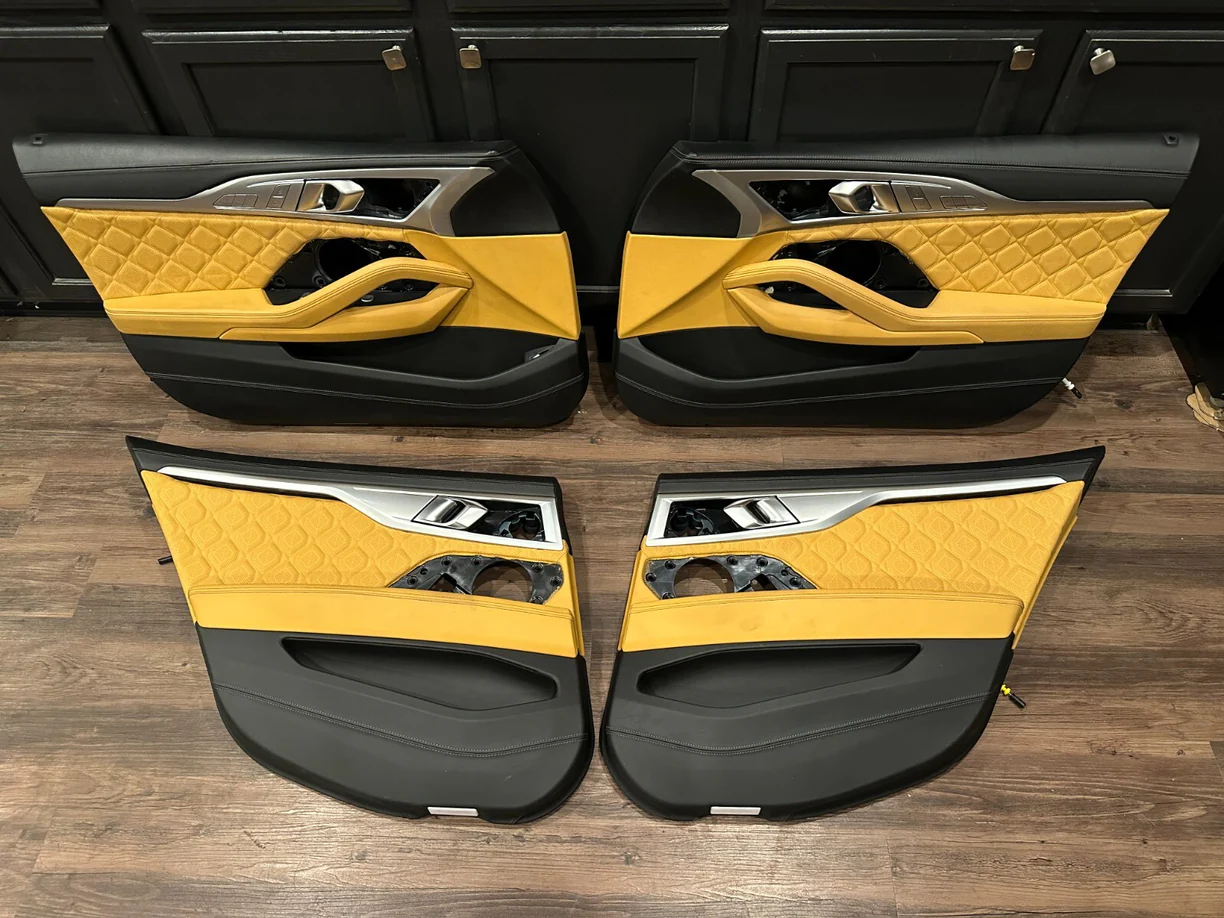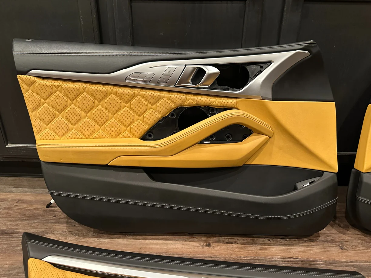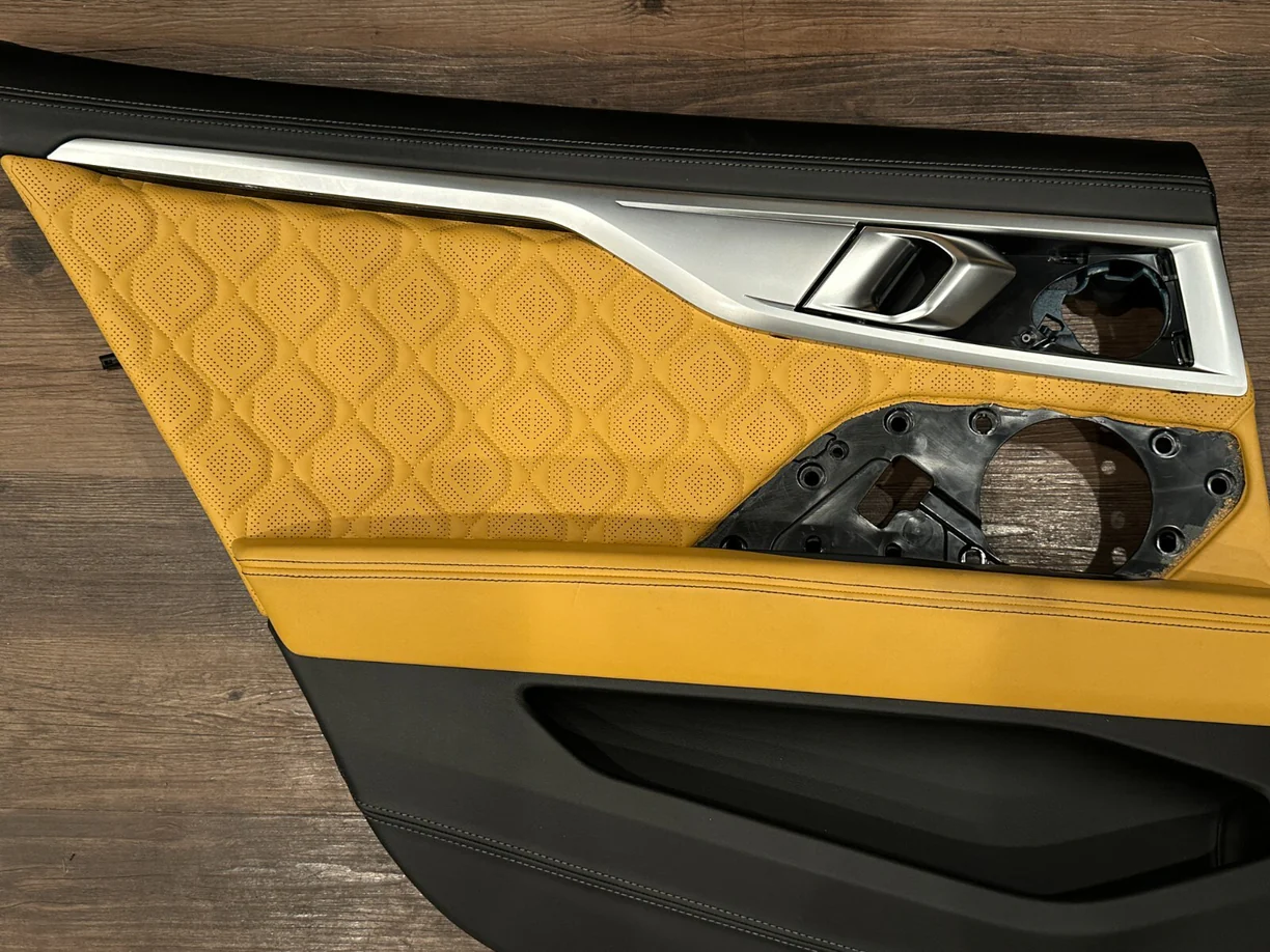 For sale is a complete set of OEM BMW Used Door Panels Europe (Left & Right) in the stunning Sakhir Orange / Black leather interior trim, removed from a 2020 BMW M8 Competition with only 39,000 miles. These door cards are factory-original components and feature the premium materials, stitching, and accent trim specific to the M8 Competition series.