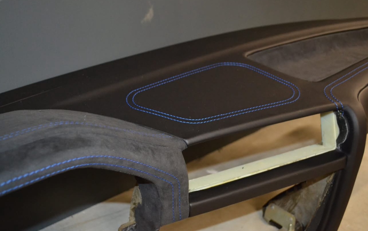 E30 Upholstered Dashboard Europe with blue stitching for sale.