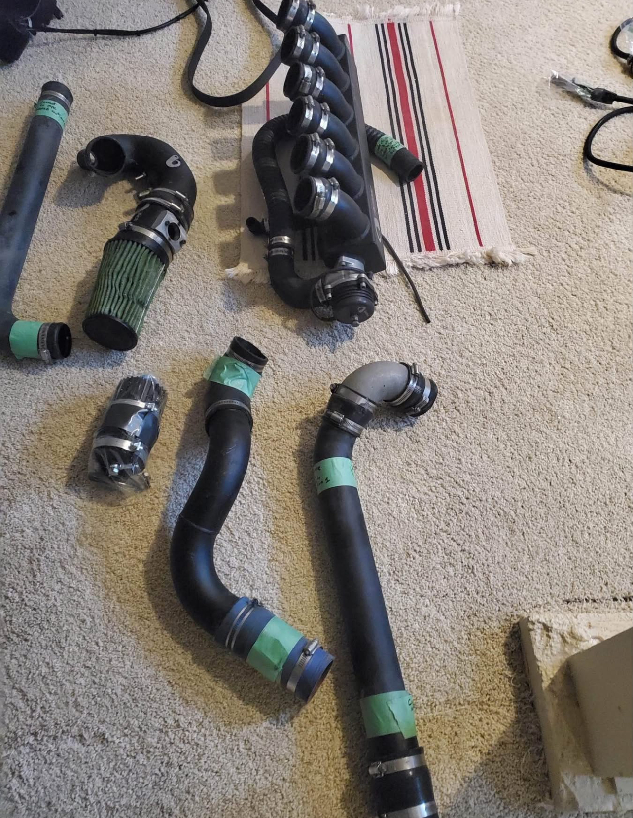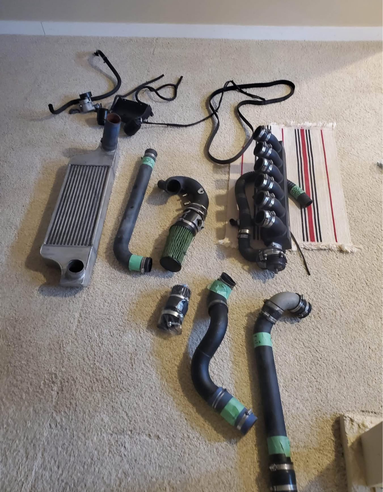 Comes with pretty much everything: fuel injectors , intercooler, supercharger, manifold, brackets, oil cooler, **the gauges behind the steering wheel are not included**, pulleys, etc. All components in great shape.